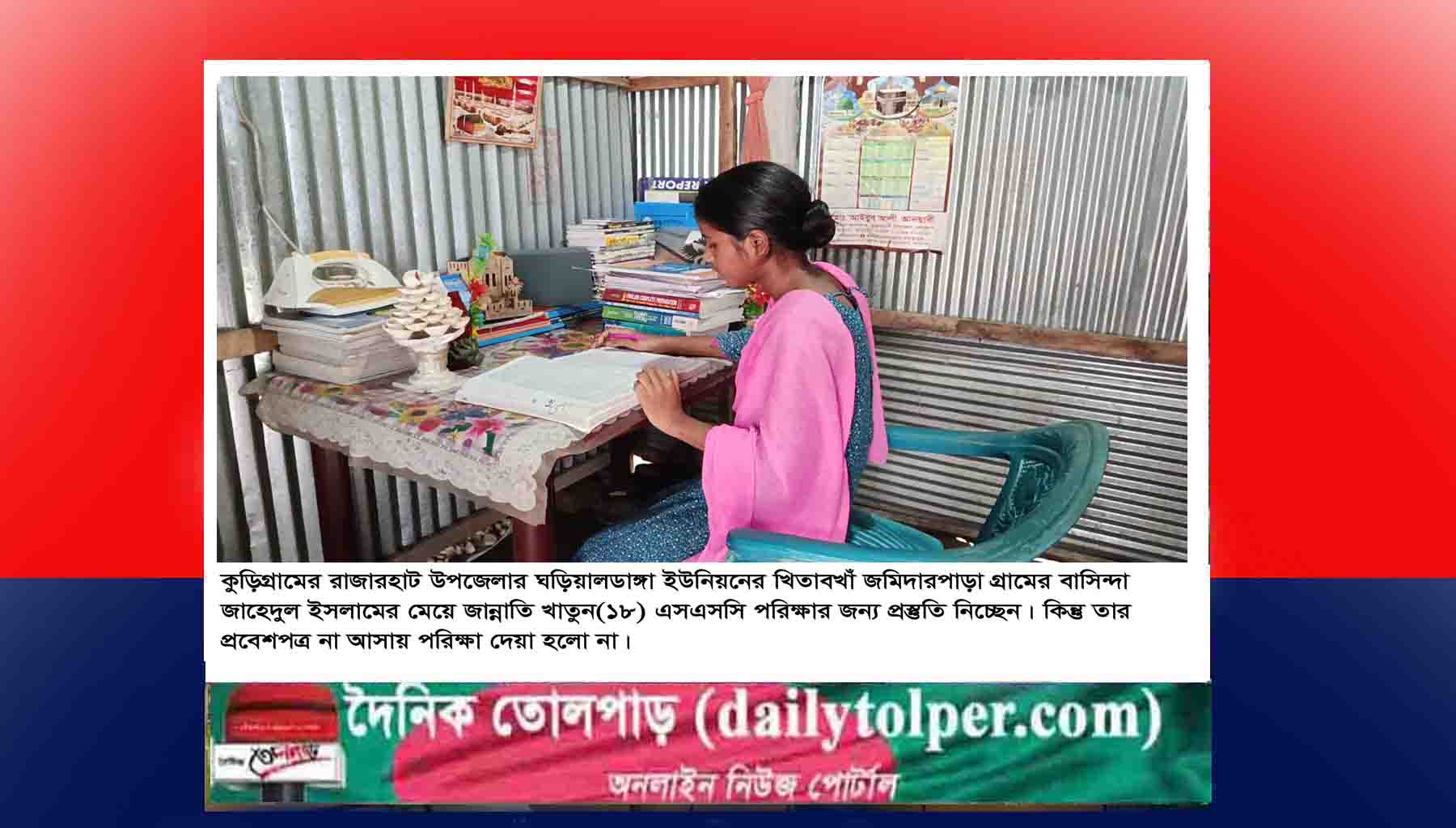 কুড়িগ্রামের রাজারহাট উপজেলার ঘড়িয়ালডাঙ্গা উচ্চ বিদ্যালয়ের শিক্ষার্থী জান্নাতি খাতুনের প্রবেশপত্র শেষ মুহূর্তেও না আসায় চলতি এসএসসি পরীক্ষায় অংশ গ্রহন করতে পারেনি। এতে একটি মূল্যবান শিক্ষাবর্ষ নষ্ট হয়েছে বলে অভিযোগ করেছেন ওই শিক্ষার্থী ও তাঁর পরিবার।