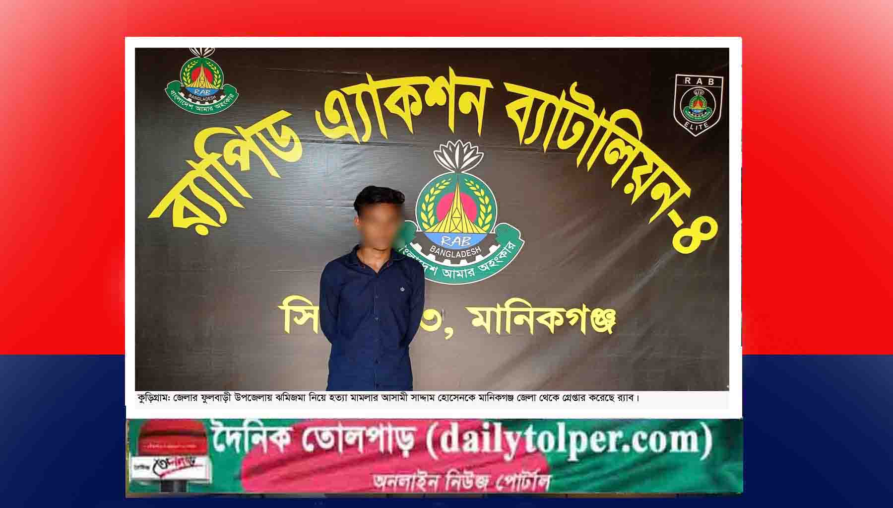 কুড়িগ্রামের ফুলবাড়ী উপজেলায় জমিজমা সংক্রান্ত বিরোধের জেরে হত্যা মামলার আসামী সাদ্দাম হোসেন (২০) কে মানিকগঞ্জ জেলা থেকে গ্রেপ্তার করেছে র্যাব। শুক্রবার বিকেল সাড়ে ৩টার সময় মানিকগঞ্জের সদর থানাধীন জেটিআই ইন্টারন্যাশনাল এলাকা থেকে অভিযান চালিয়ে তাকে গ্রেপ্তার করা হয়।