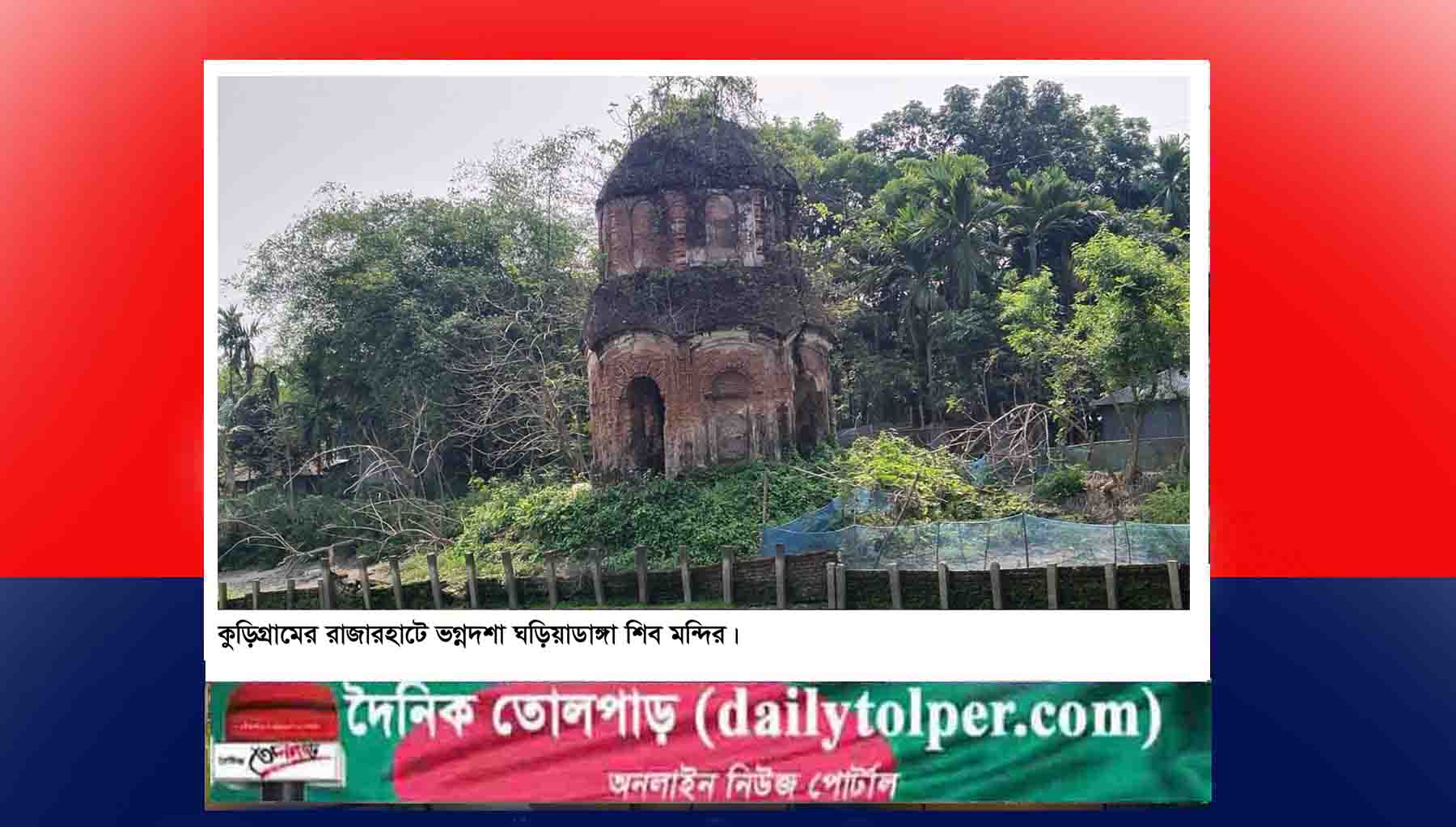 কুড়িগ্রামের রাজারহাট উপজেলার ঘড়িয়ালডাঙ্গা জমিদারবাড়ির প্রাঙ্গণে দিঘির উপরে দাঁড়িয়ে থাকা প্রায় দুই শত বছরের পুরোনো ঐতিহ্যবাহী শিব মন্দিরটি আজ ভগ্নদশায় পরিণত হয়েছে। এক সময়ের জাকজমকপূর্ণ পূজা-অর্চনা, ঢাক-ঢোলের শব্দ আর ভক্তদের পদচারণায় মুখর এই মন্দিরটি এখন নিঃসঙ্গ, পরিত্যক্ত এবং ধ্বংসের দ্বারপ্রান্তে দাঁড়িয়ে আছে। অবহেলা আর অযত্নে হারিয়ে যেতে বসেছে ঘড়িয়ালডাঙ্গা জমিদারবাড়ির এই ঐতিহ্যবাহী শিব মন্দির। সময় থাকতে প্রয়োজনীয় পদক্ষেপ না নিলে হয়তো একদিন এই মন্দিরের অস্তিত্বই বিলীন হয়ে যাবে। তাই এখনই প্রয়োজন সম্মিলিত উদ্যোগে মন্দিরটি সংরক্ষণ, সংস্কার এবং ঐতিহ্য রক্ষার দাবী করেছেন স্থানীয়রা।