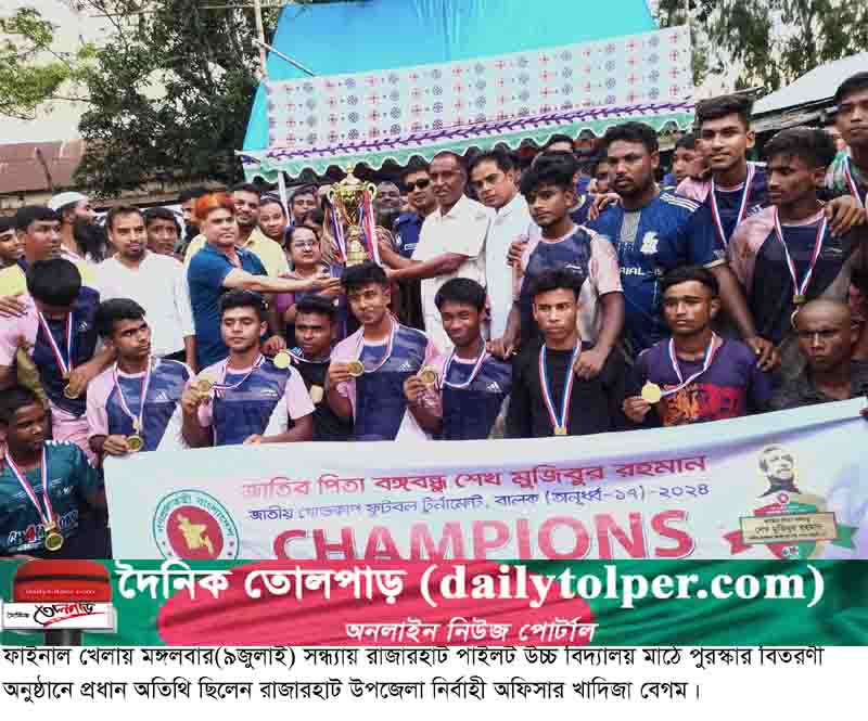 উপজেলা পর্যায়ে কুড়িগ্রামের রাজারহাট উপজেলায় জাতির পিতা বঙ্গবন্ধু শেখ মুজিবুর রহমান অনুর্ধ্ব-১৭(বালক) জাতীয় গোল্ডকাপ ফুটবল টুর্ণামেন্ট/২০২৪ এর ফাইনাল খেলা অনুষ্ঠিত হয়েছে।