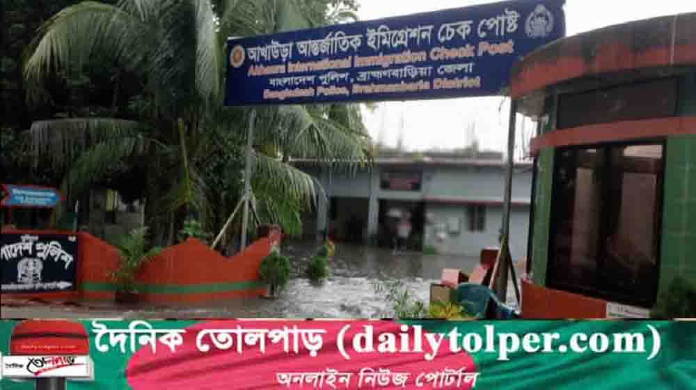 আখাউড়া উপজেলা প্রশাসন ও স্থানীয় সূত্রে জানা গেছে, মঙ্গলবার (২০ আগস্ট) রাত থেকে আখাউড়ায় ভারী বর্ষণ শুরু হয়। আজ (বুধবার) সকাল থেকে আখাউড়া আন্তর্জাতিক ইমিগ্রেশন চেকপোস্ট ও স্থলবন্দরের পাশ বয়ে যাওয়া খাল দিয়ে সীমান্তের ওপার থেকে পাহাড়ি ঢল আসতে শুরু করে। একপর্যায়ে স্থলবন্দর, বাউতলা, বীরচন্দ্রপুর, কালিকাপুর, বঙ্গেরচর, সাহেবনগরসহ কয়েকটি ইউনিয়নের অন্তত ৫০টি গ্রাম প্লাবিত হয়। এছাড়া আখাউড়া স্থলবন্দর ও ইমিগ্রেশনে যাওয়ার একমাত্র রাস্তা উপজেলার গাজীরবাজার এলাকার অস্থায়ী সেতু ভেঙে যায়। এর আগে মঙ্গলবার খলাপাড়া এলাকায় হাওড়া নদীর বাঁধের কিছু অংশ ভেঙে পানি ঢুকতে শুরু করে। খবর পেয়ে উপজেলা নির্বাহী কর্মকর্তা (ইউএনও) গাজালা পারভীন ক্ষতিগ্রস্ত এলাকা পরিদর্শন করেন। এ ব্যাপারে আখাউড়া আন্তর্জাতিক ইমিগ্রেশন পুলিশ চেকপোস্টের ইনচার্জ খায়রুল আলম বলেন, সকাল ১০টা পর্যন্ত ২০-৩০ জন যাত্রী আসা-যাওয়া করেছেন। সকাল ১০টার পর থেকে ইমিগ্রেশনের সব কার্যক্রম বন্ধ রয়েছে। কার্যালয়ের সব কক্ষে পানি ঢুকে পড়েছে বলেও জানান তিনি।