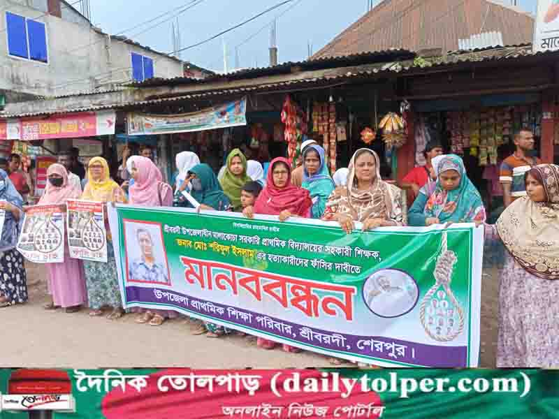শেরপুরের শ্রীবরদীতে শিক্ষককে হত্যার ঘটনায় হত্যাকারীদের গ্রেপ্তার ও ফাঁসির দাবিতে মানববন্ধন করেছে উপজেলা প্রাথমিক শিক্ষা পরিবার।