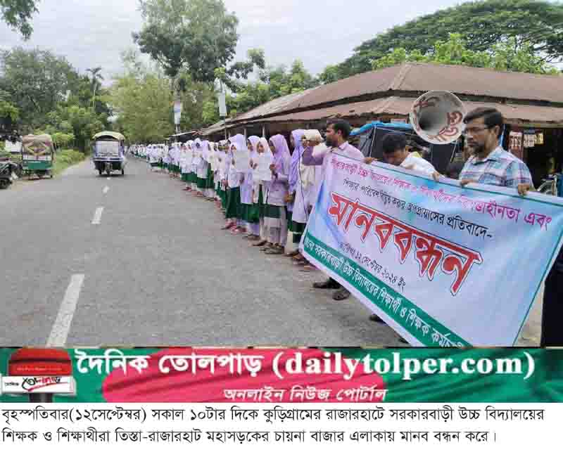 কুড়িগ্রামের রাজারহাটে সরকারবাড়ী উচ্চ বিদ্যালয়ের শিক্ষক ও শিক্ষার্থীদের নিরাপত্তাহীনতা এবং শিক্ষার পরিবেশ বিঘ্নিত করার অপপ্রয়াসের প্রতিবাদে মানববন্ধন অনুষ্ঠিত হয়েছে। বৃহস্পতিবার(১২সেপ্টেম্বর) সকাল ১০টার দিকে তিস্তা-রাজারহাট মহাসড়কের চায়না বাজার এলাকায় শিক্ষার্থী ও শিক্ষকদের সমন্বয়ে এ মানব বন্ধন অনুষ্ঠিত হয়। দুপুর ১টা পর্যন্ত মানব বন্ধন করেন শিক্ষাথীরা।