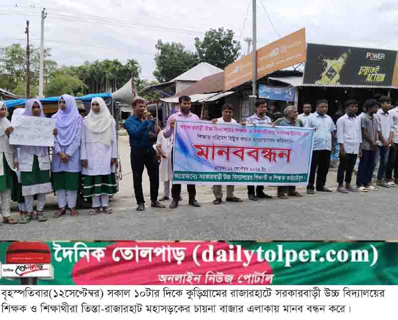 কুড়িগ্রামের রাজারহাটে সরকারবাড়ী উচ্চ বিদ্যালয়ের শিক্ষক ও শিক্ষার্থীদের নিরাপত্তাহীনতা এবং শিক্ষার পরিবেশ বিঘ্নিত করার অপপ্রয়াসের প্রতিবাদে মানববন্ধন অনুষ্ঠিত হয়েছে। বৃহস্পতিবার(১২সেপ্টেম্বর) সকাল ১০টার দিকে তিস্তা-রাজারহাট মহাসড়কের চায়না বাজার এলাকায় শিক্ষার্থী ও শিক্ষকদের সমন্বয়ে এ মানব বন্ধন অনুষ্ঠিত হয়। দুপুর ১টা পর্যন্ত মানব বন্ধন করেন শিক্ষাথীরা।