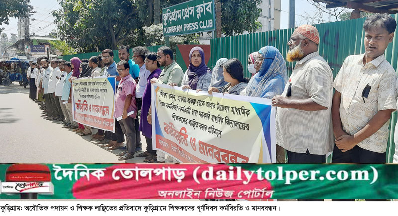 বক্তারা বলেন, সরকারি মাধ্যমিক শিক্ষকদের বিধিসম্মত উচ্চপদগুলো প্রকল্প থেকে আগত কর্মকর্তাগণ অবৈধভাবে দখল করার প্রচেষ্টা চালাচ্ছে। যেখানে বিশ^বিদ্যালয়ের শিক্ষকগণ বিশ^বিদ্যালয় প্রশাসন চালায়, সরকারি কলেজের শিক্ষকগণ কলেজ প্রশাসন চালায়, সেখানে সরকারি মাধ্যমিক শিক্ষকগণ মাধ্যমিক প্রশাসন চালাবে এটাই বিধিসম্মত। কিন্তু আওয়ামী সরকারের শিক্ষা সচিব এন.আই খানের পৃষ্ঠপোষকতায় বিধি বহির্ভূতভাবে সেসিপ প্রকল্প থেকে মানবিক দিক বিবেচনায় উপবৃত্তি কর্মকর্তাগণ চাকরি স্থায়ীকরণের সুযোগ লাভ করে। বর্তমানে আবারও নিয়োগবিধি না থাকার পরেও তারা জোরপূর্বক জেলা শিক্ষা অফিসার (চঃ দাঃ) পেতে মাউশিতে বিশৃঙ্খলা করে। আমরা এর তীব্র প্রতিবাদ জানাচ্ছি। আমরা অযৌক্তিক পদায়ন বন্ধ ও অপরাধীদের দৃষ্টান্তমূলক শাস্তির দাবিতে আজ কুড়িগ্রামে পূর্ণদিবস কর্মবিরতি ও মানববন্ধন আয়োজন করেছি। আমাদের দাবি অগ্রাহ্য করা হলে পরবর্তীতে কঠোর কর্মসূচি দিতে বাধ্য হবো। মানববন্ধনে অর্ধ শতাধিক শিক্ষক-শিক্ষিকা অংশগ্রহন করেন।