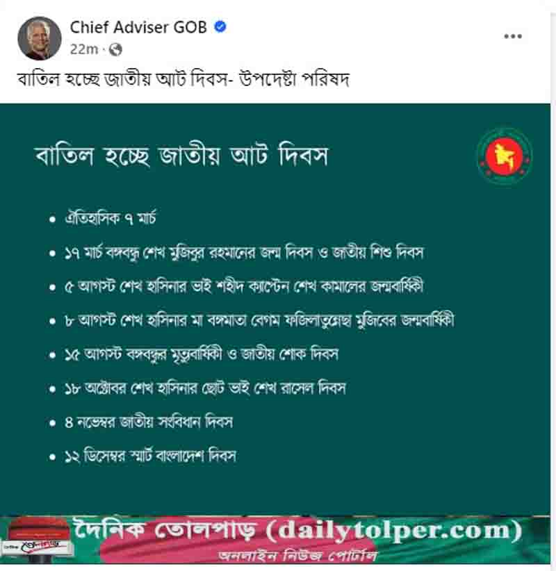 জাতীয় শোক, শিশু ও ঐতিহাসিক ৭ মার্চসহ আটটি দিবস বাতিল করছে অন্তর্বর্তী সরকার। গত সেপ্টেম্বর মাসে উপদেষ্টা পরিষদের বৈঠকে এ বিষয়ে সিদ্ধান্ত নেয়া হয়। সাম্প্রতিক প্রেক্ষাপট বিবেচনা করে সরকার এসব জাতীয় দিবস বাতিলের সিদ্ধান্ত নিয়েছে বলে সংশ্লিষ্ট সূত্রে জানা গেছে।