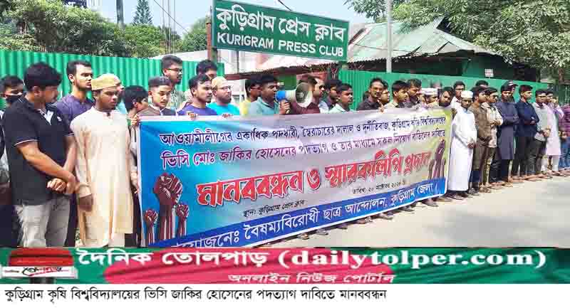 কুড়িগ্রাম কৃষি বিশ্ববিদ্যালয়ের ভাইস চ্যানচেলর (ভিসি) জাকির হোসেনের পদত্যাগ দাবিতে মানববন্ধন করেছে বৈষম্য বিরোধী ছাত্র জনতা। রবিবার সকালে বৈষম্য বিরোধী ছাত্র জনতার ব্যানারে কুড়িগ্রাম প্রেসক্লাবের সামনে ঘন্টাকালব্যাপী মানববন্ধন অনুষ্ঠিত হয়।