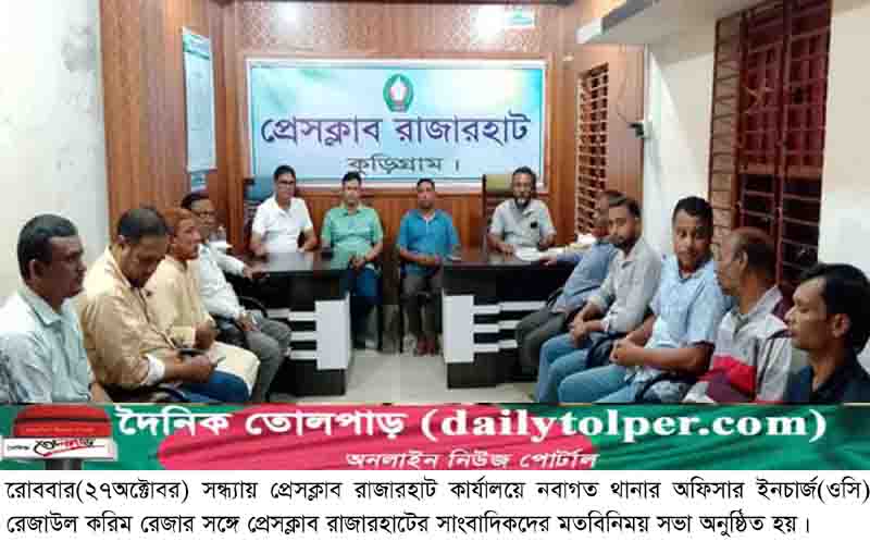 রোববার(২৭অক্টোবর) সন্ধ্যায় প্রেসক্লাব রাজারহাট কার্যালয়ে নবাগত থানার অফিসার ইনচার্জ(ওসি) রেজাউল করিম রেজার সঙ্গে প্রেসক্লাব রাজারহাটের সাংবাদিকদের মতবিনিময় সভা অনুষ্ঠিত হয়েছে।