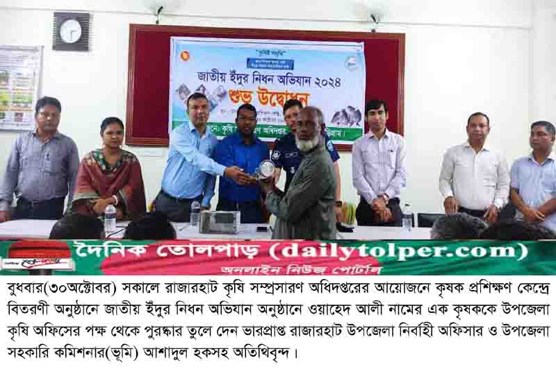 বুধবার(৩০অক্টোবর) সকালে রাজারহাট কৃষি সম্প্রসারণ অধিদপ্তরের আয়োজনে কৃষক প্রশিক্ষণ কেন্দ্রে জাতীয় ইঁদুর নিধন অনুষ্ঠানে পুরষ্কার তুলে দিয়েছেন ভারপ্রাপ্ত রাজারহাট উপজেলা নির্বাহী অফিসার ও উপজেলা সহকারি কমিশনার(ভূমি) আশাদুল হকসহ অতিথিবৃন্দ।