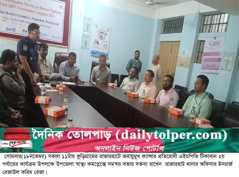 'এক ডোজ এইচপিভি টিকা নিন, জরায়ুমুখ ক্যান্সার রুখে দিন' এই স্লোগানকে ধারণ করে কুড়িগ্রামের রাজারহাটে জরায়ুমুখ ক্যান্সার প্রতিরোধী এইচপিভি টিকাদান ২য় পর্যায়ের কার্যক্রম উপলক্ষে সমন্বয় সভা অনুষ্ঠিত হয়েছে।
