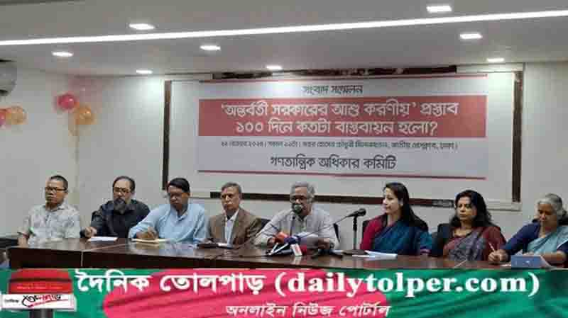 এর আগে ‘অন্তর্বর্তী সরকারের আশু করণীয়’ নিয়ে ১৩ দফা প্রস্তাব দিয়েছিল গণতান্ত্রিক অধিকার কমিটি। অন্তর্বর্তী সরকারের ১০০ দিনে সেই প্রস্তাবগুলো কতটুকু বাস্তবায়ন হয়েছে সেই বিষয়ে সংবাদ সম্মেলনে আলোকপাত করেন অধ্যাপক আনু মুহাম্মদ।