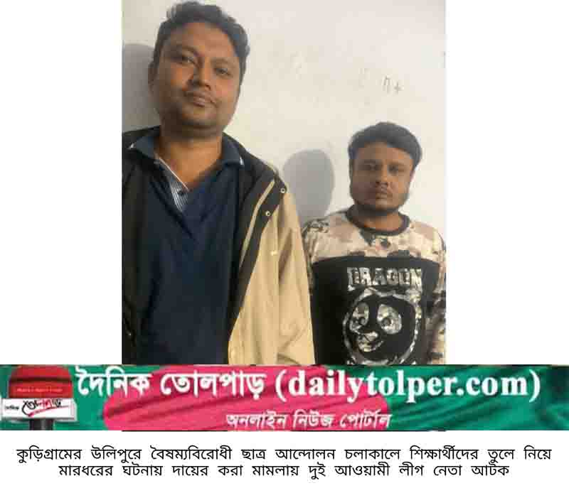 কুড়িগ্রামের উলিপুরে বৈষম্যবিরোধী ছাত্র আন্দোলন চলাকালে শিক্ষার্থীদের তুলে নিয়ে মারধরের ঘটনায় দায়ের করা মামলায় দুই আওয়ামী নেতাকে গ্রেপ্তার করেছে পুলিশ। গত শুক্রবার রাতে উপজেলার গুনাইগাছ ইউনিয়ন থেকে তাদের আটক করা হয়।
