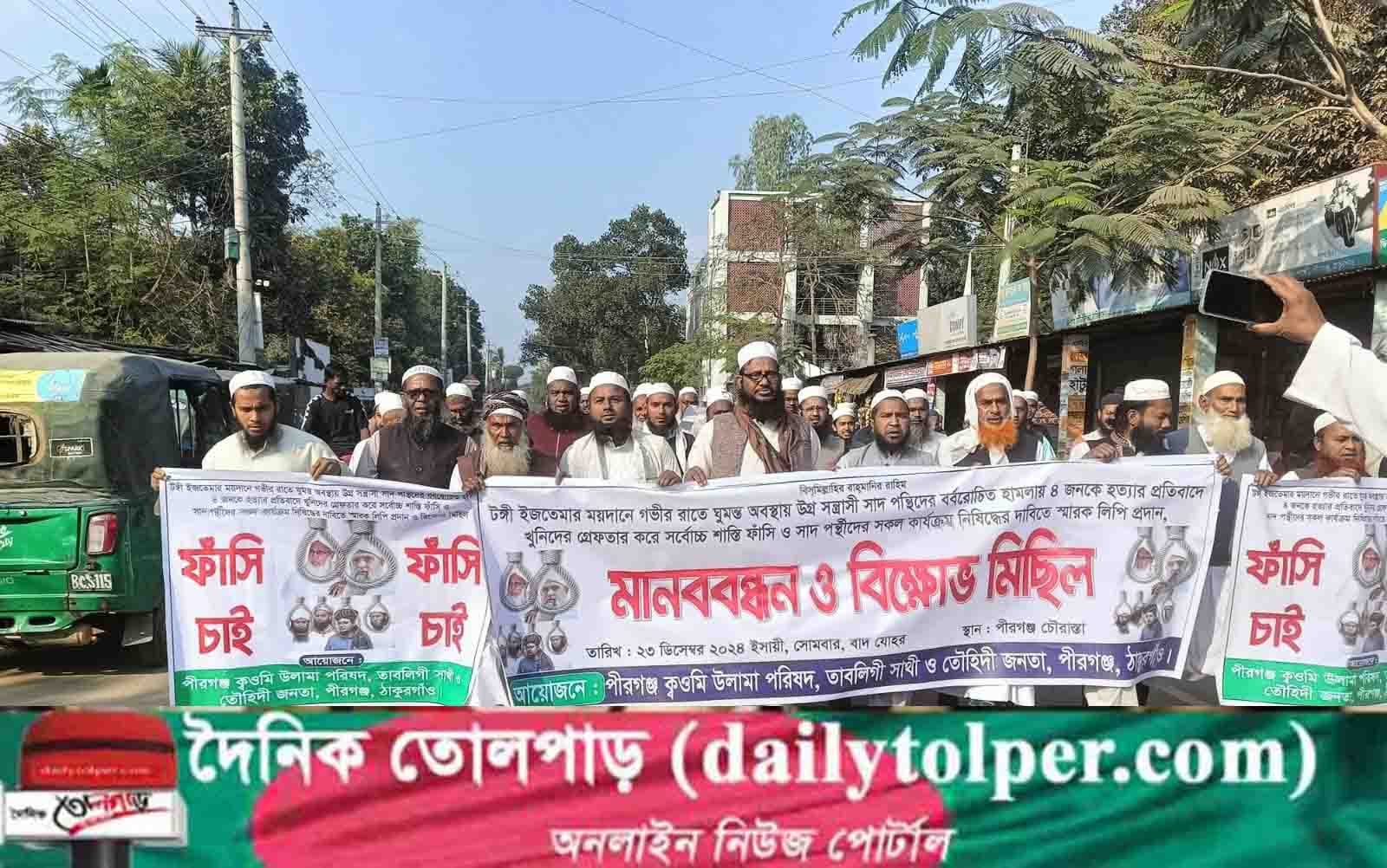 টঙ্গী ইজতেমার ময়দানে গভীর রাতে ঘুমন্ত অবস্থায় উগ্র সন্ত্রাসী সাদ পন্থীদের বর্বরোচিত হামলায় ৪ জনকে হত্যা করার প্রতিবাদে হত্যাকারীদের ফাঁসির দাবীতে মানববন্ধন ও বিক্ষোভ মিছিল হয়েছে।