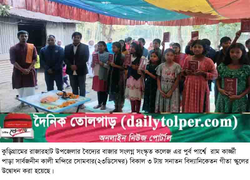 কুড়িগ্রামের রাজারহাট উপজেলার বৈদ্যের বাজার সংলগ্ন সংস্কৃত কলেজ এর পুর্ব পার্শ্বে রাম কার্জ্জী পাড়া সার্বজনীন কালী মন্দিরে সোমবার(২৩ডিসেম্বর) বিকাল ৩ টায় সনাতন বিদ্যানিকেতন গীতা স্কুলের উদ্বোধন করা হয়েছে।
