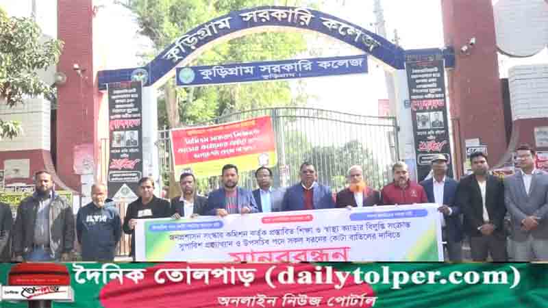 কুড়িগ্রামে আন্তঃক্যাডার বৈষম্য নিরসন পরিষদ এর মানববন্ধন অনুষ্ঠিত হয়েছে । বৃহস্পতিবার কুড়িগ্রাম সরকারি কলেজ চত্বরে অনুষ্টিত মানববন্ধনে বক্তব্য রাখেন কুড়িগ্রাম সরকারি কলেজের অধ্যক্ষ মির্জা নাসির ঊদ্দিন ,শিক্ষক পরিষদের সম্পাদক মোঃ মোস্তাফিজুর রহমান,রাষ্ট্রবিঞ্জান বিভাগের সহযোগী অধ্যাপক ড. আনিসুজ্জামান, রসায়ন বিভাগের সহযোগী অধ্যাপক ড. মোঃ সাইফুর রহমান প্রমুখ ।