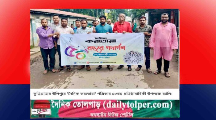 আব্দুল মালেক : কুড়িগ্রামের উলিপুরে ‘দৈনিক করতোয়া’ পত্রিকার ৫০তম প্রতিষ্ঠাবার্ষিকী পালিত হয়েছে। মঙ্গলবার (১২ আগস্ট) দুপুরে এ উপলক্ষে পৌর শহরের দয়ালপাড়া এলাকার করতোয়া পত্রিকার অস্থায়ী কার্যালয় থেকে একটি র্যালি বের