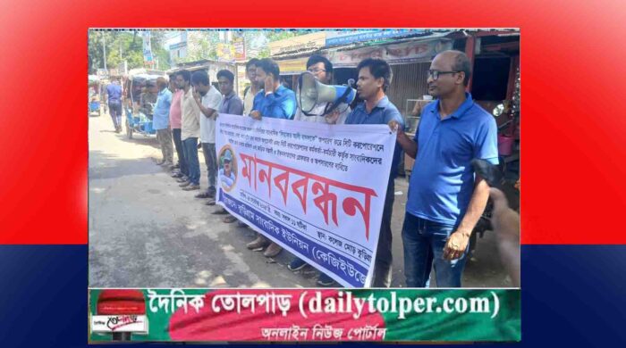 সংবাদদাতা, কুড়িগ্রাম: সম্প্রতি গাজীপুরে পেশাগত দায়িত্ব পালনকালে সাংবাদিক আসাদুজ্জামান তুহিনকে নৃশংসভাবে হত্যার প্রতিবাদে মানববন্ধন ও বিক্ষোভ করেছে কুড়িগ্রামের রাজিবপুর উপজেলার বিভিন্ন পর্যায়ের সাংবাদিকবৃন্দ। ১৩ আগষ্ট’২৫ বুধবার বিকেলে রাজিবপুরের স্থানীয় সাংবাদিকদের