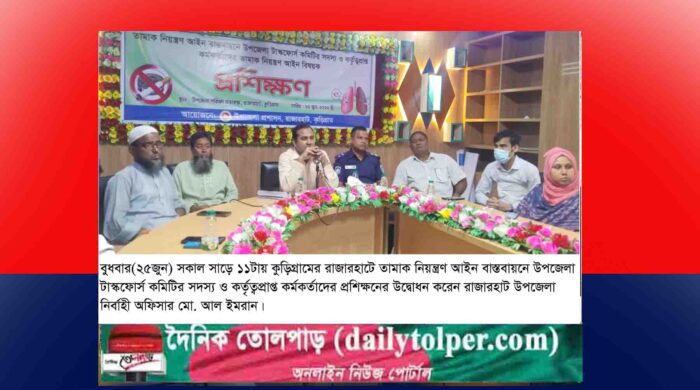 প্রহলাদ মন্ডল সৈকত: কুড়িগ্রামের রাজারহাটে তামাক নিয়ন্ত্রণ আইন বাস্তবায়নে উপজেলা টাস্কফোর্স কমিটির সদস্য ও কর্তৃত্বপ্রাপ্ত কর্মকর্তাদের প্রশিক্ষণ অনুষ্ঠিত হয়েছে। বুধবার(২৫জুন) সকাল সাড়ে ১১টায় উপজেলা পরিষদ সভাকক্ষে উপজেলা প্রশাসনের আয়োজনে প্রশিক্ষনের