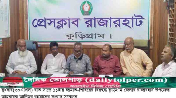 সংবাদদাতা, রাজারহাট(কুড়িগ্রাম): বাংলাদেশ জাতীয়তাবাদী দল(বিএনপি) এর কুড়িগ্রাম জেলার রাজারহাট উপজেলা শাখার আহবায়ক আনিছুর রহমান এক সংবাদ সম্মেলন করেছেন। গত বুধবার(৩০এপ্রিল) রাত সাড়ে ১১টায় প্রেসক্লাব রাজারহাটে এ সংবাদ সম্মেলন অনুষ্ঠিত হয়।