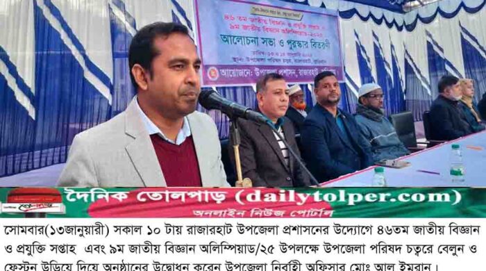 প্রহলাদ মন্ডল সৈকত: ৪৬তম জাতীয় বিজ্ঞান ও প্রযুক্তি সপ্তাহ এবং ৯ম জাতীয় বিজ্ঞান অলিম্পিয়াড/২৫ উপলক্ষে বর্ণাঢ্য র্যালী আলোচনা সভা ও পুরষ্কার বিতরন অনুষ্ঠান অনুষ্ঠিত হয়েছে। সোমবার সকাল ১০ টায় রাজারহাট