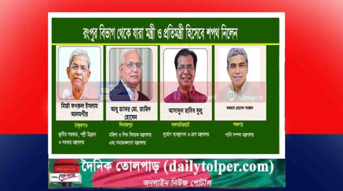 মঙ্গলবার(১৭ফেব্রুয়ারী)বিকালে ত্রয়োদশ জাতীয় সংসদ নির্বাচনে নিরঙ্কুশ জয় পাওয়া বিএনপির নির্বাচিতরা নতুন মন্ত্রিসভার সদস্যরা জাতীয় সংসদ ভবনের দক্ষিণ প্লাজায় শপথ নিয়েছেন। এর মধ্যে রংপুর বিভাগ থেকে যারা মন্ত্রী হয়ে শপথ গ্রহন