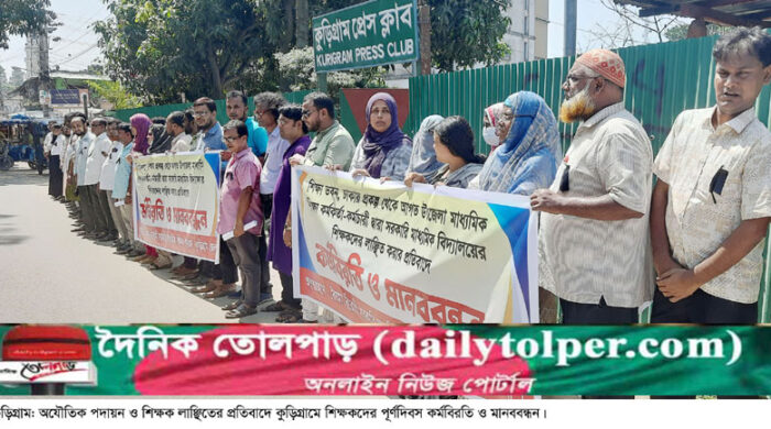 হুমায়ুন কবির সূর্য: ঢাকার শিক্ষাভবনে উপজেলা মাধ্যমিক শিক্ষা কর্মকর্তা ও কর্মচারী কর্তৃক সরকারি মাধ্যমিক বিদ্যালয়ের শিক্ষকদের উপর অতর্কিত হামলার প্রতিবাদে কুড়িগ্রাম জেলার বৈষম্যবিরোধী শিক্ষক পরিষদের ব্যানারে বুধবার (১৮ সেপ্টেম্বর) দুপুর