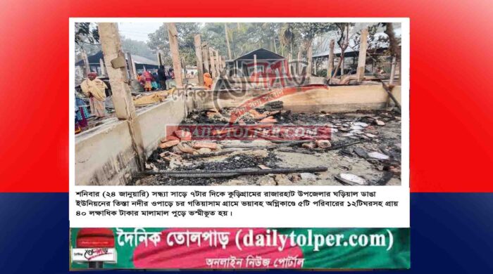 আব্দুল মালেক : কুড়িগ্রামের উলিপুরে বিদ্যুৎস্পৃষ্টে লক্ষণ রায় (২৫) নামে এক যুবকের মৃত্যু হয়েছে। শুক্রবার (২৩ জানুয়ারি) দুপুরে উপজেলার বুড়াবুড়ি ইউনিয়নের দলবাড়ি দাসপাড়া এলাকায় এই ঘটনাটি ঘটেছে। লক্ষণ রায় ওই