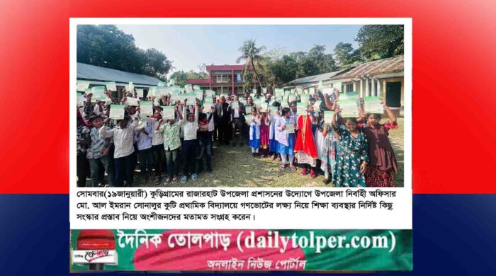 প্রহলাদ মন্ডল সৈকত: কুড়িগ্রামের রাজারহাট উপজেলার বিভিন্ন শিক্ষা প্রতিষ্ঠানে শিক্ষক, অভিভাবক ও শিক্ষার্থীদের অংশগ্রহণে গণভোটকে কেন্দ্র করে রাজারহাট উপজেলা নির্বাহী অফিসার মো. আল ইমরান ব্যাপক প্রচারণা চালাচ্ছেন। সোমবার(১৯জানুয়ারী রাজারহাট উপজেলা
