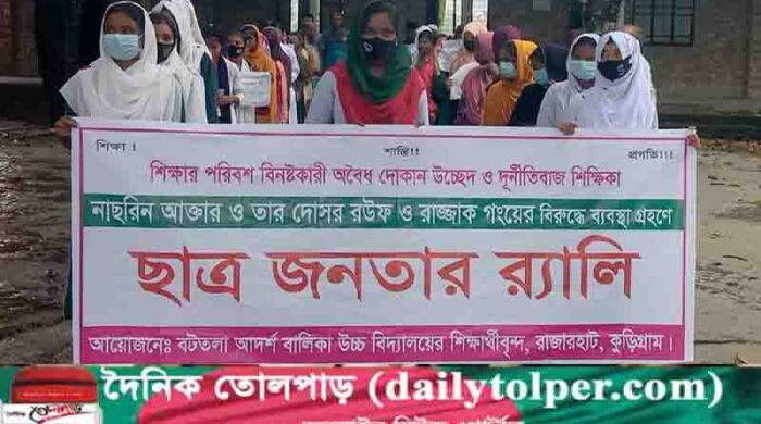আমিনুল ইসলাম: কুড়িগ্রামের রাজারহাটে বটতলা আদর্শ বালিকা উচ্চ বিদ্যালয়ে শিক্ষার পরিবেশ ফিরিয়ে আনতে শিক্ষার্থী ও অভিভাবকরা বিক্ষোভ মিছিল ও সমাবেশ করেছে। বৃহস্পতিবার(৫সেপ্টেম্বর) দুপুরে ওই প্রতিষ্ঠান চত্বরে শিক্ষার্থী-অভিভাবক ও এলাকাবাসীরা একটি