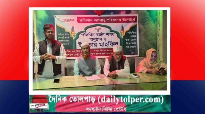 হুমায়ুন কবির সূর্য: “আইসো বাহে কোনঠে সবাই, পলিথিন বর্জন করিয়া পরিবেশ বাঁচাই’ এই শ্লোগান নিয়ে পলিথিন বর্জনের শপথ এবং দোয়া ও ইফতার মাহফিল অনুষ্ঠিত হয়েছে। সোমবার বিকেলে কুড়িগ্রাম জেলা জলবায়ু
