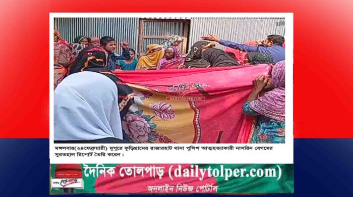 প্রহলাদ মন্ডল সৈকত: কুড়িগ্রামের রাজারহাটে গলায় ওড়না পেঁচিয়ে এক গৃহবধু আত্মহত্যা করেছে। ঘটনাটি ঘটেছে, মঙ্গলবার(২৪ফেব্রুয়ারী) সকাল ১০টায় উপজেলার রাজারহাট সদর ইউনিয়নের চান্দামারী গ্রামে। আত্মহত্যাকারী নাসরিন বেগম(২৫) ওই গ্রামের বয়লার মুরগী